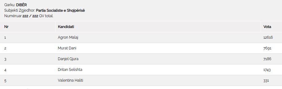 Ndërkohë, në kampin blu më i votuari në Qarkun Dibër është kandidati Xhemal Gjunkshi me 5,693 vota. I dyti në listë është Përparim Spahiu me 5,505 vota dhe i treti Basir Çollaku me 4,599 vota.