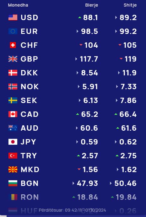 Sot, më 1 tetor 2024, në tregun valutor, dollari amerikan blihet me 88 lekë dhe shitet 89.2 lekë.